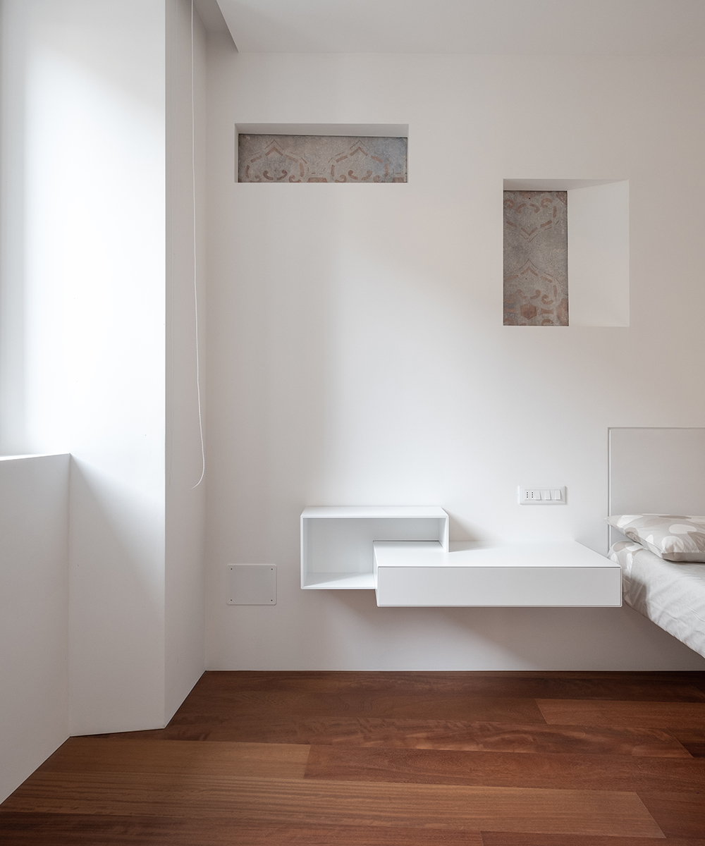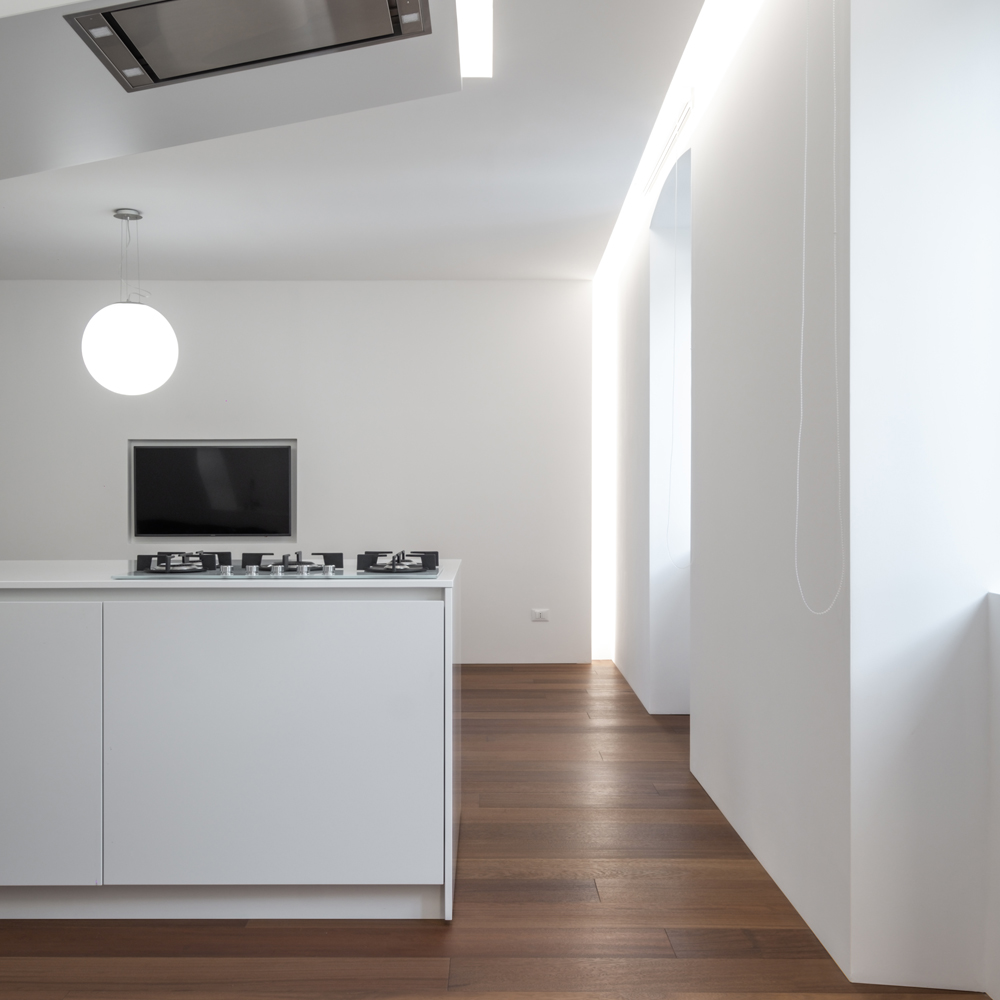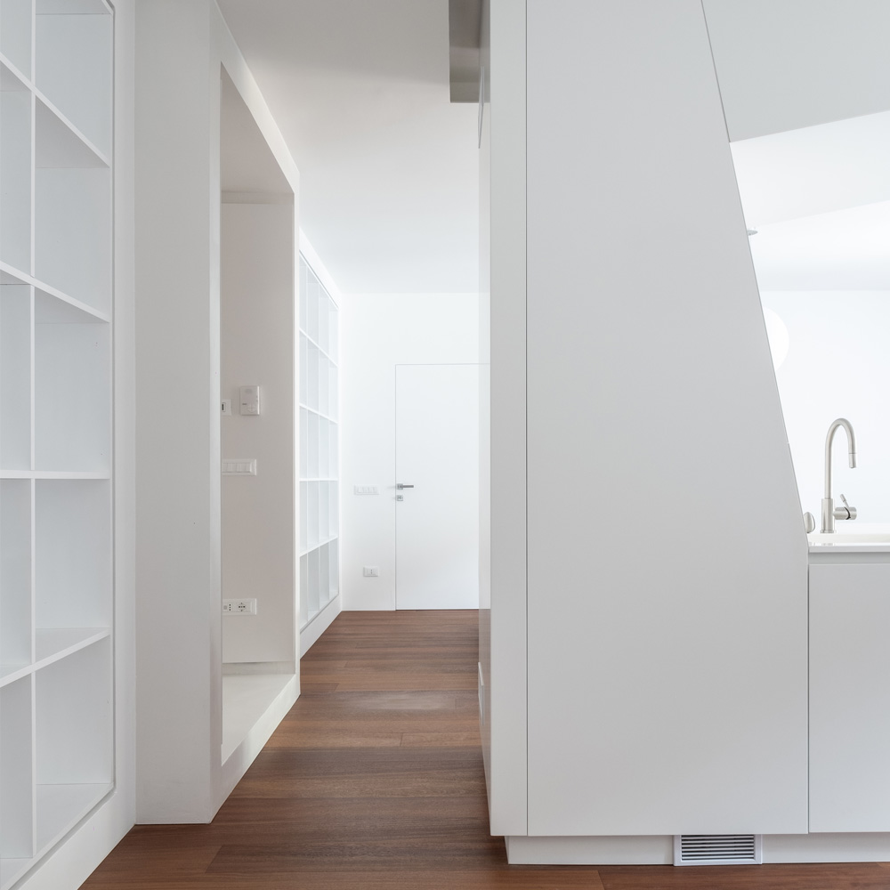 L’utilizzo di pochi materiali e pochi colori, le pareti libere da mobili e l’essenzialità dell’arredo sono scelte progettuali finalizzate a conferire sobrietà agli ambienti che verranno arricchiti vivendoli nel tempo.