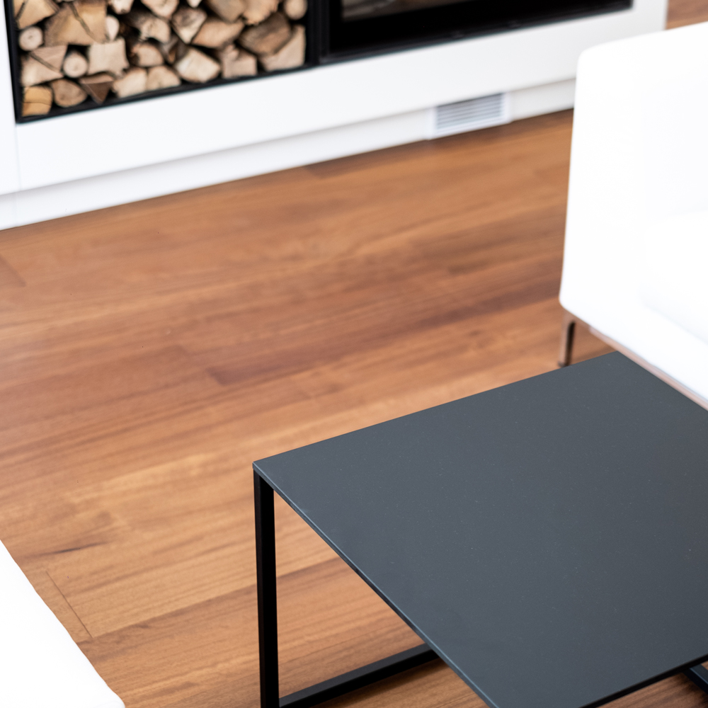 La scelta del pavimento in legno della CP parquet essenza iroko ha permesso di raggiungere l’obiettivo visivo desiderato; essendo di tonalità molto calda va in contrasto con il contesto completamente bianco con porte interne raso muro e tinteggiate come le pareti e l’arredamento di design. Le diverse dimensioni delle doghe crea dinamicità e movimento nella posa.